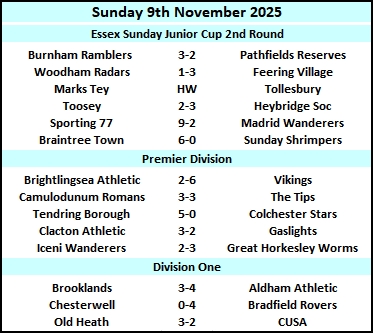 | 09/11/2025 | Premier Division | Iceni Wanderers | 2-3 | Great Horkesley Worms | |